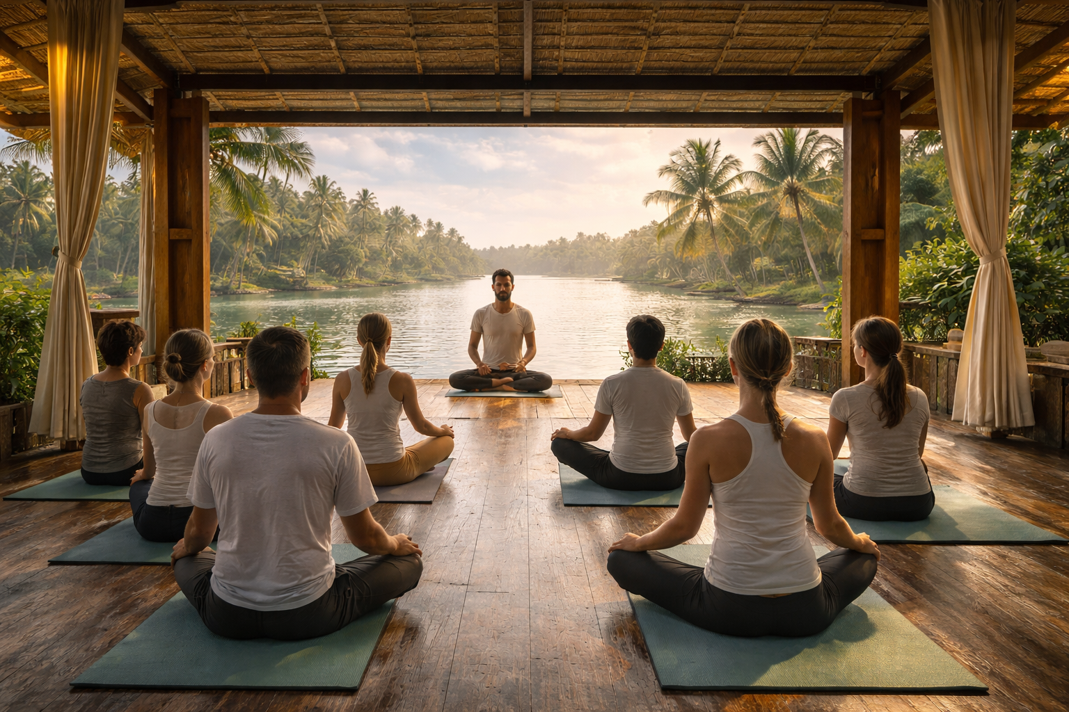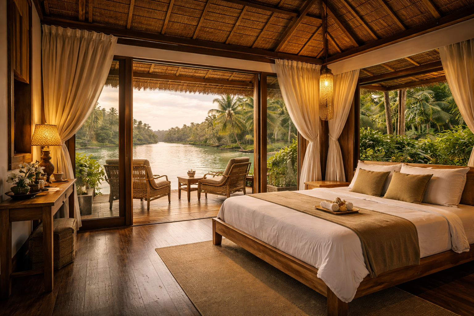 Wake up to gentle ripples, birdsong, and golden reflections on Kerala’s pristine backwaters.